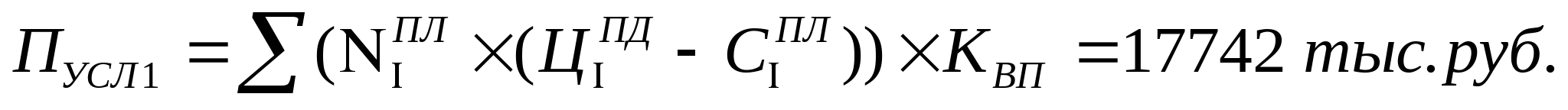 План по сумме прибыли от реализации продукции в отчетном году перевыполнен на 1396 тыс. руб. (19 296 - 17 900), или на 7,8%. Если сравнить сумму прибыли плановую и условную, исчисленную исходя из фактического объема и ассортимента продукции, но при плановых ценах и плановой себестоимости продукции, узнаем, насколько она изменилась за счет объема и структуры реализованной продукции: ΔП(N, Уд) = 18 278 - 17 900 = +378 тыс. руб. Чтобы найти влияние только объема продаж, необходимо плановую прибыль умножить на процент перевыполнения (недовыполнения) плана по реализации продукции в оценке по плановой себестоимости или в натурально-условном исчислении (15 760 : 15 900 х 100 - 100 = -0,88%) и результат разделить на 100: ΔП(N) = 17 900 х (-0,88%) / 100 = -158 тыс. руб. Затем можно определить влияние структурного фактора из первого результата нужно вычесть второй): ΔП(Уд) = 378 - (-158) = +536 тыс. руб. Влияние изменения полной себестоимости на сумму прибыли устанавливается сравнением фактической суммы затрат плановой, пересчитанной на фактический объем продаж: ΔП(С) = 78 322 - 80 639 = -2317 тыс. руб. Изменение суммы прибыли за счет отпускных цен на продукцию определяется сопоставлением фактической выручки с условной, которую бы предприятие получило за фактический объем реализации продукции при плановых ценах: ΔП(Ц) = 99 935 - 96 600 = +3335 тыс. руб. Эти же результаты можно получить и способом цепной подстановки, последовательно заменяя плановую величину каждого факторного показателя фактической.      Сначала нужно найти сумму прибыли при фактическом объеме продаж и плановой величине остальных факторов. Для этого следует рассчитать коэффициент выполнения плана по peaлизации продукции (КВП), а затем плановую сумму прибыли скорректировать на этот коэффициент. Выполнение плана по реализации рассчитывают сопоставлением фактического объема реализации с плановым в натуральном (если продукция однородная), условно-натуральном (в данном примере тысячи условных банок) и стоимостном выражении (если продукция неоднородна по своему составу), для чего желательно использовать базовый (плановый) уровень себестоимости отдельных изделий, так как себестоимость меньше подвержена влиянию структурного фактора, чем выручка. На данном предприятии выполнение плана по реализации составляет:  Если бы не изменилась величина остальных факторов, сумма прибыли должна была бы уменьшиться на 0,88% и составить 17 742 тыс. руб. (17 900 х 0,9912). Затем следует определить сумму прибыли при фактическом объеме и структуре реализованной продукции, но при плановой себестоимости и плановых ценах. Для этого необходимо от условной выручки вычесть условную сумму затрат: = 96 600 - 78 322 = 18 278 тыс. руб. Нужно подсчитать также, сколько прибыли предприятие могло бы получить при фактическом объеме реализации, структуре и ценах, но при плановой себестоимости продукции. Для этого от фактической суммы выручки следует вычесть условную сумму затрат: = 99 935 - 78 322 = 21 613 тыс. руб. По данным расчетов можно установить, как изменилась сумма прибыли за счет каждого фактора. Изменение суммы прибыли за счет: - объема реализации продукции: ΔП(N) = Пусл1 - Ппл = 17 742 - 17 900 = -158 тыс. руб.; - структуры товарной продукции: ΔП(стр) = Пусл2 - Пусл1 = 18 278 - 17 742 = +536 тыс. руб.; - средних цен реализации: ΔП(Ц) = Пусл3 - Пусл2 = 21 613 - 18 278 = +3335 тыс. руб.; с - себестоимости реализованной продукции: ΔП(С) = Пф - Пусл3 = 19 296 - 21 613 = -2317 тыс.