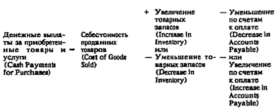 Выплаты денежных средств за приобретенные товары и услуги. Чтобы определить величину денежных средств, выплаченных за приобретенные товары и услуги, сумму себестоимости проданных товаров из отчета о прибылях и убытках необходимо скорректировать. Корректировка происходить в два этапа. Сначала из суммы себестоимости проданных товаров необходимо получить величину чистого приобретения. Затем полученная сумма корректируется с учетом изменений, происшедших в счетах по расчетам с поставщиками, или в счетах к оплате. Если сумма товарных запасов увеличилась в текущем отчетном периоде по сравнению с прошедшим, то чистое приобретение будет больше себестоимости проданных товаров. Если же сумма товарных запасов уменьшилась, то чистое приобретение будет меньше, чем себестоимость проданных товаров. В противоположность этому, если сумма по счетам к оплате увеличилась, сумма выплат денежных средств за приобретение товаров и услуги будет больше суммы чистого приобретения. Эту взаимосвязь можно выразить следующим образом на рисунке 7.