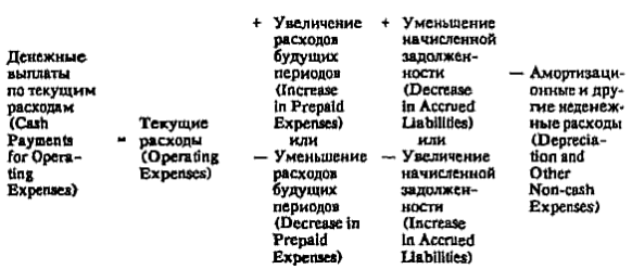 Ни к каким изменениям в денежных средствах эта операция не привела. Тем не менее сумма текущих расходов в отчете о прибылях и убытках при корректировке должна быть уменьшена на величину амортизационных и других неденежных расходов. Описанные выше три этапа корректирования величины текущих расходов можно суммировать следующим уравнением, на схеме 2.