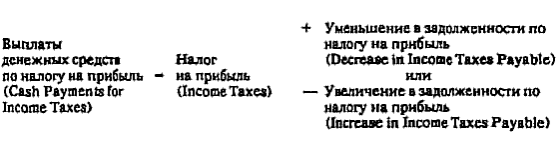 Выплаты денежных средств по налогу на прибыль. Для определения суммы денежных средств по выплате налога на прибыль величина начисленного в течение года налога из отчета о прибылях и убытках корректируются на сумму изменений в задолженности перед бюджетом. Если задолженность по уплате налога на прибыль уменьшилась в текущем отчетном периоде по сравнению с предыдущим, выплаты денежных средств в погашение задолженности по налогу на прибыль превысят величину начисленных в течение года налогов. Если такая задолженность увеличилась, то сумма денежных выплат в погашение задолженности по налогу на прибыль будет меньше суммы налога на прибыль, начисленного в течение года. Иначе эту зависимость можно представить следующим образом: