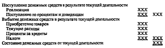 Прямой метод подразумевает трансформирование каждой статьи отчета о прибылях и убытках. В этом случае начинают с денежных поступлений от реализации продукции, из которых вычитают все денежные выплаты по приобретению товаров, текущим расходам, процентам за кредит и выплатам в бюджеты. В итоге выводят сумму состояния денежных средств от текущей деятельности, на рисунке 3.