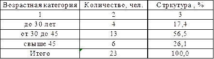 Следует отметить, что подавляющее большинство рабочих основного производства это сотрудники в возрасте от 30 до 45 лет, т.е. люди среднего возраста. Удельный вес которых в общей численности составляет 56,5%, тогда как рабочие до 30 лет составляют 17,4%, а рабочие свыше 45 лет – 26 ,1%