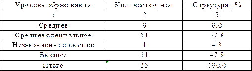 Анализируя структуру персонала по уровню образования, следует отметить, что 47,9% сотрудников имеют высшее образование, тогда как среднее специальное образование имеют 11 человек, что составляет 47,8%. Это говорит о высоком квалификационном уровне работников ГУП Завода «Телерадиобыттехника».