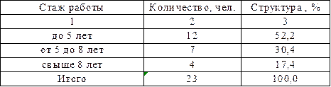 Что касается стажа работы, то необходимо отметить, что большинство работников имеют стаж работы до 5 лет (52,2%), от 5 до 8 лет имеют 7 человек, что составляет – 30,4% и всего 17,4% персонала основного производства работают свыше 8 лет. Анализ показывает, что предприятию свойственна текучесть кадров, что влечёт за собой недостаточное взаимопонимание сотрудников между собой.