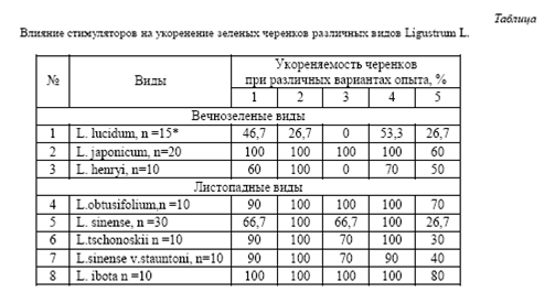 Самое лучшее укоренение (100%) у разных видов было получено при использовании корневина, гетероауксина. Самая низкая укореняемость среди вечнозеленых видов выявлена у L. lucidum. Самая высокая – во всех вариантах у L. japonicum. У L. henryi 100% укоренение при использовании корневина.