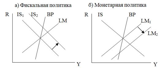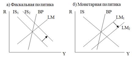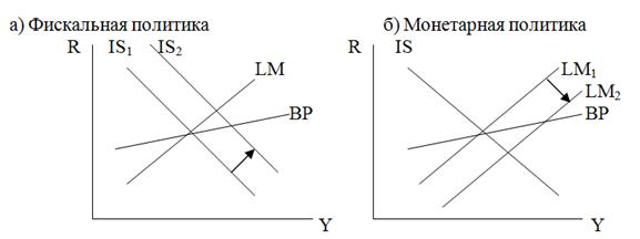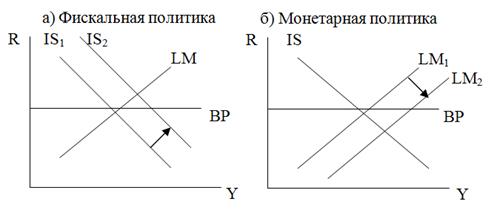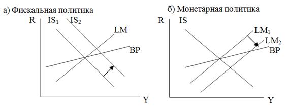 Высокая мобильность капитала. В этом случае эффективность монетарной политики возрастает. Капитал в большей степени реагирует на снижение внутренней ставки процента, и поэтому отток капитала более значительный, чем в условиях низкой мобильности капитала, что ведет к большему дефициту платежного баланса и необходимости более существенного снижения стоимости национальной валюты. Экспорт растет в большей мере, поэтому прирост дохода больше. Совершенная мобильность капитала. В условиях совершенной мобильности капитала эффективность монетарной политики максимальна. Снижение национальной ставки процента в результате сдвига кривой LM ведет к оттоку капитала, а рост дохода – к увеличению импорта, что обусловливает дефицит платежного баланса. Обесценение национальной валюты стимулирует чистый экспорт, и кривая IS сдвигается вправо до тех пор, пока не восстановится равенство национальной ставки процента мировой. Доход возрастает в максимальной степени. Особенностью этого случая в отличие от условий низкой и высокой мобильности капитала является то, что 1) не сдвигается кривая ВР и 2) монетарный импульс воздействует только на чистый экспорт, не оказывая влияние на внутренние компоненты совокупного спроса.