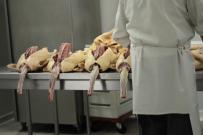 Смена декораций: мы переместились в лаборатрию. Здесь чисто и бело, как в операционной, шапочка, халат, сменная обувь. К счастью для меня, птиц забили сегодня утром до нашего приезда, уже нестрашные тушки подвешены в холодильном отсеке — вся команда безмолвно принимается за разделку. У каждого своя функция, все движения четкие, рука тверда, нож уверенно скользит по поверхности, отрезая одинаково ровные кусочки. Совсем не обращая внимания на груду мяса на столе, зачарованно смотрю на этот отлаженный часовой механизм.