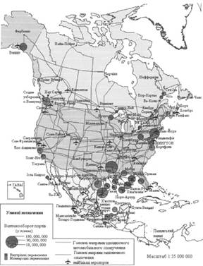 Рассмотрим подробнее составные части (компоненты) транспортно-логистической деятельности в странах НАФТА. Транспортные услуги. Северная Америка имеет достаточно хорошо развитую транспортную систему (рис. 3). Представлены все современные виды транспорта, которые в полной мере обеспечивают потребности хозяйства, как на региональном, так и на мировом уровне. Общая протяженность железных дорог стран НАФТА — достигает 388, 8 тыс. км (транзитные дороги США и Канада имеют протяженность 7, 2 тыс. км); автодорог — 8, 05 млн. км, внутренних водных путей — 9, 662 тыс. км (Великие озера) и 44, 826 (судоходные реки США и Канады), трубопроводов — 2, 69 млн. км. Важнейшие системы морских портов сформировались вокруг Нью-Йорка, Хьюстона и Лос-Анджелеса. Транспортные услуги на рынке логистики предоставляют многочисленные специализированные перевозчики, использующие только один вид транспортных средств (железнодорожные, автомобильные, воздушные, водные и др.), перевозчики, практикующие смешанные формы перевозок (мультимодальные) и посредники (брокеры, экспедиторы и т.п.). Пик развития мультимодальных перевозок пришелся на 1950-е годы, когда наряду с демонополизацией транспорта, появились контрейлеры — синтез железнодорожного и автомобильного транспорта. Такая форма транспортировки является весьма эффективной и экономной, ведь она предусматривает сочетание выгодных характеристик каждого вида транспорта для оптимизации перевозок, например, сочетание дешевых железнодорожных перевозок на большие расстояния с гибкостью автомобильного транспорта на коротких маршрутах. Выделяют следующие виды смешанных (контрейлерных) перевозок: автопоезд — железная дорога; наземно-водные перевозки (эта форма перевозок используется как на внутренних водных путях, так и на прибрежных линиях судоходства и при перемещении груза между Великими озерами и портами на атлантическом побережье США).