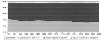 Логистика получила наибольшее практическое развитие на Североамериканском континенте, прежде всего, в США (рис. 1). Поэтому и общий рынок логистических услуг стран НАФТА достиг значительного развития и в 2ОО6 г. его общая емкость оценивалась в 1310 млрд. долл. США (тогда как в 1997 г. показатель составлял 1035 млрд. долл. США), что составляло примерно 9, 9 % ВВП стран Северной Америки. Распределение затрат по видам деятельности — следующее: 809 млрд. долл. США — транспортные услуги; 446 млрд. долл. США — услуги складирования, 55 млрд. долл. США — административные расходы (рис. 2). При этом объем рынка логистических услуг Северной Америки, предоставляемых крупнейшими специализированными компаниями на условиях аутсорсинга, составлял в 2ОО6 г. около 113, 6 млрд. долл. США (тогда как в 2003г. — 76, 9 млрд. долл. США).
