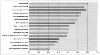 Канада. Логистические услуги в Канаде предоставляются как традиционными транспортными, складскими и экспедиторскими фирмами, так и аутсорсинговыми компаниями. Расходы на логистику составляют 12% ВВП страны (70, 191 млрд. долл. США). Объем канадского рынка логистики оценивается в 50 млрд. долл. США (2005г.), причем логистические сделки стоимостью еще 75 млрд. долл. США выполняются непосредственно фирмами без участия логистических посредников. Стоимость экспорта логистических услуг составляет 7, 6 млрд. долл. США, что составляет 12% от общей стоимости экспортируемых услуг Канады. Зачастую фирмы пользуются услугами специализированных логистических фирм для выполнения следующих логистических операций: внутренние и международные перевозки, экспедирование грузов и таможенная очистка товаров (рис. 13).