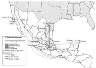Довольно интересна географическая направленность грузовых перевозок в Мексике (рис. 17). Так, основные грузопотоки направлены от Мехико, которое играет роль главного дистрибуционного узла страны, в другие штаты, при этом преобладают автомобильные и воздушные грузоперевозки. Перевозки водным транспортом направлены, главным образом, из Салина-Крус – крупнейшего порта Мексики на Тихоокеанском побережье.