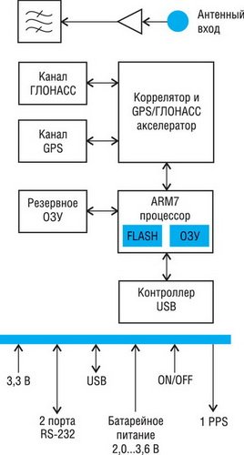 Приемник использует сигналы со спутников обеих навигационных систем ГеоС-1, что позволяет определить точное местоположение объекта там, где это невозможно (или возможно с ограничениями - режим 2D) в случае использования систем по отдельности. Приемник ГеоС-1 способен получать данные местоположения, используя или только сигналы ГЛОНАСС, или только GPS, или работая по совмещенному созвездию ГЛОНАСС+GPS. Структурная схема приемника представлена на рис. 4.