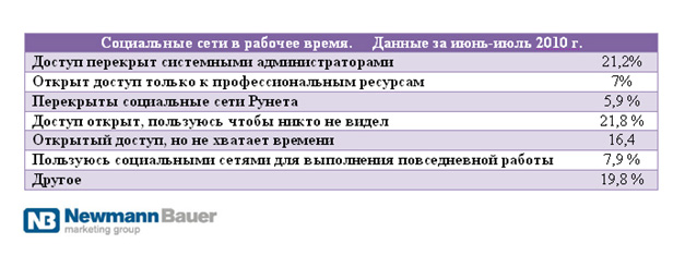 В результате проведенных нами полевых исследований выяснилось, что больше половины работающих россиян (51, 6 %) не имеют доступа к социальным сетям в рабочее время. В опросе участвовали 6000 работающих россиян из крупных городов России с население свыше 1 млн. человек. Тема опроса: «Есть ли у вас доступ к социальным сетям в рабочее время» ответы распределились следующим образом: