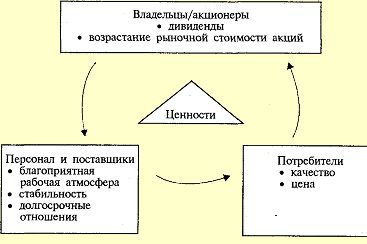 Процветающее предприятие — это предприятие, получающее устойчивую прибыль от своей деятельности. Эта задача-максимум может быть реализована на стабильной основе только через осознание и наиболее полное удовлетворение общественных потребностей или, согласно получившей широкое распространение в международной теории и практике бизнеса концепции, через создание системы ценностей для трех общественных групп: владельцев (акционеров) предприятия, потребителей его продукции, поставщиков и персонала предприятия. Владельцы (акционеры) предприятия заинтересованы в постоянном и все возрастающем потоке доходов и таком использовании собственных и привлеченных средств, которое увеличивает ценность принадлежащей им собственности. Персонал и поставщики заинтересованы в стабильности предприятия, в развитии с ним долгосрочных отношений, в благоприятной рабочей атмосфере. Для потребителей наивысшую ценность представляют товары и услуги, удовлетворяющие их по качеству и цене (рис. 1).