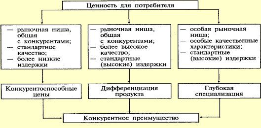 Основной рабочий инструмент в реализации целевой функции предприятия — это его рыночная стратегия, в рамках которой реализуются конкурентные преимущества предприятия. Конкурентное преимущество — это то, что отличает данное конкретное предприятие от его конкурентов и обеспечивает устойчивое положение на рынке. Конкурентные преимущества связаны либо с качественными характеристиками товаров (услуг), либо с более низкими ценами на продукцию предприятия. В международной теории и практике бизнеса различают три основных вида рыночной стратегии предприятия, анализу которых посвятил свои исследования американский экономист Майкл Портер. Для того чтобы успешно осуществлять свою деятельность в условиях рыночной конкуренции, предприятия должны продавать товары или предоставлять услуги либо по более низкой цене, чем их конкуренты (конкурентоспособные цены), либо с такими качественными характеристиками, которые ставят их вне конкуренции (дифференциация продукта);либо придав им особые свойства, которые удовлетворяют потребности узкого круга потребителей (глубокая специализация) (рис. 2).