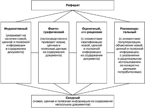 Другими словами, реферирование как процесс и форма представления информационного результата (собственно реферат) имеет ряд основных модификаций: сигнальное, оценочное и рекомендательное реферирование.