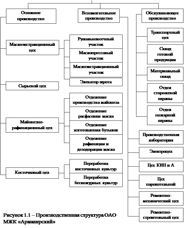 Производство предприятия состоит из основных цехов: маслоэкстракционного, сырьевого, майонезно-рафинационного и косточкового, вспомогательных и обслуживающих производств и участков. Производственная структура ОАО МЖК «Армавирский» представлена на рисунке 1.1. Тип построения производственной структуры предприятия – предметный.  |