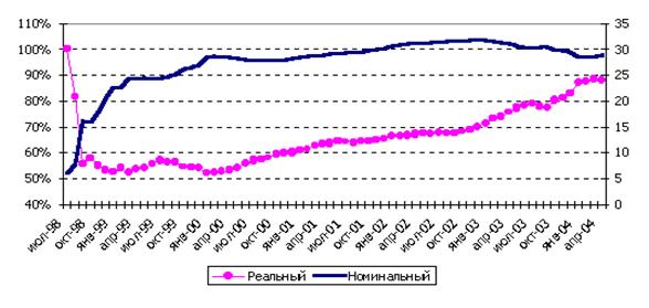 В итоге удалось за довольно короткий промежуток времени обеспечить сближение краткосрочных показателей доходности основных активов, номинированных в иностранной валюте и рублях. Это позволило Банку России сбалансировать к началу лета потоки краткосрочного капитала и существенно сократить свое участие на валютном рынке, повысив уровень его саморегулируемости. Номинальный курс рубля к доллару США по итогам девяти месяцев 2003 года вырос на 4,1%,в то время как по отношению к евро номинальный курс рубля снизился на 5,4%. По итогам девяти месяцев 2003 года реальный эффективный курс рубля по отношению к декабрю 2002 года повысился на 3,9%. Относительная стабильность номинального обменного курса рубля способствовала притоку иностранных инвестиций и техническому переоснащению производства.