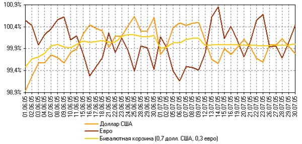 Динамика курса доллара США к рублю в июле 2005 года определялась преимущественно факторами внешнеэкономической конъюнктуры. В начале месяца на мировом валютном рынке еще сохранялась тенденция к укреплению доллара США, и курс американской валюты к рублю за первую декаду вырос с 28,63 до 28,84 руб./долл. США. Однако со второй декады месяца на мировом валютном рынке началось некоторое ослабление позиций доллара США, связанное, в частности с решением Европейского Центрального банка сохранить процентную ставку на прежнем уровне – 2% и ревальвацией китайского юаня, сопровождавшейся заявлением со стороны Народного банка Китая о том, что в будущем курсовая политика КНР станет более гибкой. Последнее привело к укреплению евро, йены и ряда других азиатских валют к доллару США. Курс доллара США к рублю на этом фоне снизился с 28,84 руб./долл. США в первой декаде июля до уровня начала месяца, 28,63 руб./долл. США.