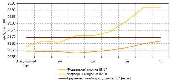 Под влиянием общей тенденции к некоторому укреплению рубля, сформировавшейся на внутреннем валютном рынке, на форвардном рынке рубль/доллар США в конце июля - начале августа сложились ожидания некоторого снижения курса доллара США относительно среднего курса за июль (см. рис. 5).