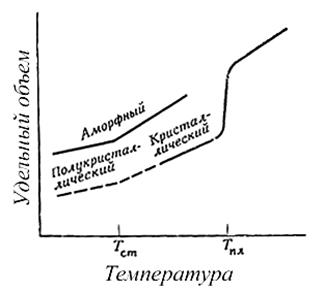 подвергаются кристаллизации лишь частично, подобные полукристаллические полимеры характеризуются температурой плавления и температурой стеклования. Тепловые переходы легко измерить по изменению таких свойств, как удельный объем, теплоемкость. На рисунке приведена зависимость удельного объема от температуры для полностью аморфного и полностью кристаллического полимера (сплошные линии). Температура плавления — этот переход первого рода с очень резким изменением удельного объема; температура стеклообразования — это переход второго рода характеризующийся лишь изменением температурного коэффициентом удельного объема. Соответствующая кривая для полукристаллического полимера состоит из кривой для кристаллического полимера и пунктирной линии, соответствующей переходной области в стеклообразное состояние.