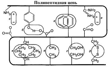 а) электростатическое взаимодействие; б) водородная связь; в) гидрофобные взаимодействия неполярных групп; г) диполь‑дипольное взаимодействие; д) дисульфидная (ковалентная) связь