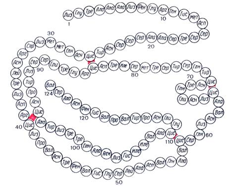 Рис. 4. Первичная структура РНКазы. (выделены четыре дисульфидные связи).