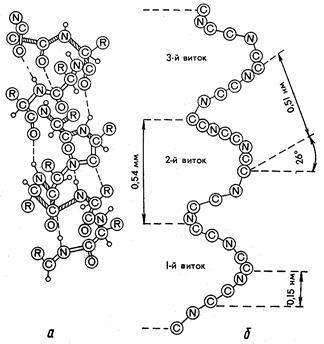 Рис. 6. a-спиральная а) полипептидная цепь a-пептидной конфигурации; б) скелет спирали.