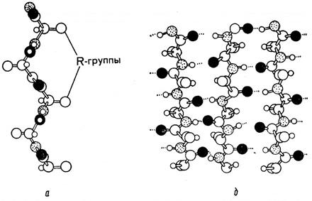 При таком пространственном расположении аминокислотной последовательности образуется система параллельно и антипараллельно размещенных фрагментов одной или нескольких полипептидных цепей. Полипептидные цепи в b-складках полностью вытянуты.