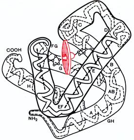 Полипептидная цепь миоглобина представлена в виде изогнутой трубки, компактно уложенной вокруг гема (небелкового компонента, содержащего железо).