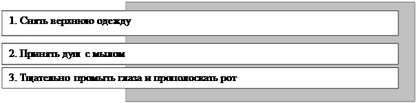 Ситуация 2. При аварии на химическом предприятии была получена информация о времени и месте сбора населения для экстренной эвакуации на транспорте. До места сбора Вам пришлось добираться по зараженной местности, используя простейшие средства защиты органов дыхания – ватно-марлевые повязки. Вам необходимо определить действия пред посадкой в транспортное средство после выхода из зоны заражения и заполнить схему.