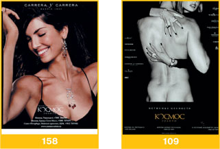 Реклама с довольной улыбающейся женщиной заняла второе место по желанию предстать в таком образе перед оценивающим окружением и 11 место – для стабильного окружения. При этом рекламный макет той же сети ювелирных салонов, где женщина в экстазе обнимает голую мужскую спину является лидером по негативному восприятию – 41 место для оценивающего окружения, 42 (последнее) - для стабильного и самый низкий показатель «желание сохранить фото»[13]