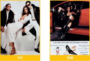 Достаточно привлекательными оказались образы, где мужчины выступают лишь в роли статистов, подчеркивающих независимость и превосходство женщины. Особенно четко это разделение ролей заметно в упоминавшейся выше рекламе «Обувь. Мир Кожи», а также в рекламном макете GUCCI, где женщина уверенно позирует на фоне двух очень условных мужчин.