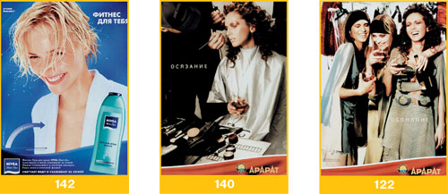 Эти рекламные макеты можно смело признать неэффективными и даже вредными, т.к. во всем своем окружении женщины не нашли ни одного важного персонажа, для которого они хотели бы сыграть ту роль, которая транслируется этими рекламами. Т.е. женщины никак не идентифицируют себя с героиней рекламы, а следовательно и с брендом (фотографии с кодами 140, 109, 170, 130).