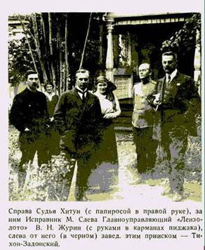 Нам приходилось довольно часто выезжать из города на прииски расположенные по обе стороны реки Бодайбо (на протяжении 40-50-ти верст) и вести следствие на местах. Судья Хитун, (он не сказал Ваш отец) — его голос был четок и сух, — должен был по иску Ленского Товарищества, согласно закону, подписать акт о выселении рабочих из занимаемых ими бараков. Он исполнял директивы его начальника — Министра Юстиции Щегловитого. Иначе, — его маленькая рука сделала жест в сторону, — иначе он был бы... отозван. — А Щегловитов не хотел навлечь на себя неудовольствие «царства в Царстве» — Лензолото. (Ленское Золотопромышленное Товарищество, при добычи в 750 пудов золота в год, имело активные шэры очень заманчивые для биржевых дельцов.)