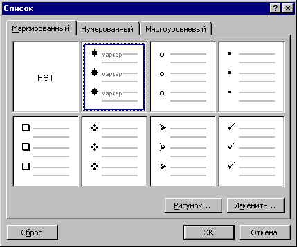 выбирается тип нумерации (арабские или римские цифры, буквы латинского алфавита).