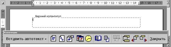 Введенный текст колонтитула располагается в пунктирной рамке, указывающей границы колонтитула. Текст колонтитула форматируется как обычный текст. Для вставки номеров страниц используется кнопка . В режиме отображения колонтитулов основный текст документа редактировать невозможно.