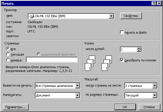 напечатается указанный набор страниц. Например: чтобы напечатать страницы 1, 5, 11, 12, 13, необходимо ввести в поле слева: 1, 5, 11-13.