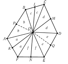 , то есть a + f = c + d. Следовательно, ломаная POQ делит шестиугольник на две части равной площади, а значит, отрезок PQ проходит через точку О.