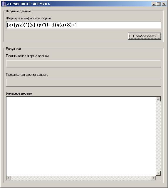 Любые изменения данной программы легко реализуются при наличии установленного на компьютере «Borland C++ Builder 4» и определенных знаний в области программирования. Данный же программный продукт представляет собой рабочую версию программы, реализующую в себе функцию распознавание формулы, последующий перевод в префиксную и постфиксную форму записи и построение бинарного дерева.