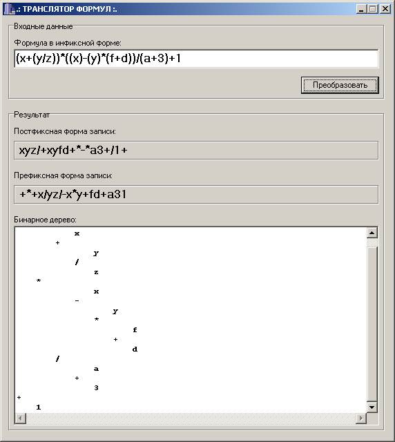 (x+(y/z))*((x)-(y)*(f+d))/(a+3)+1 – инфиксная форма записи