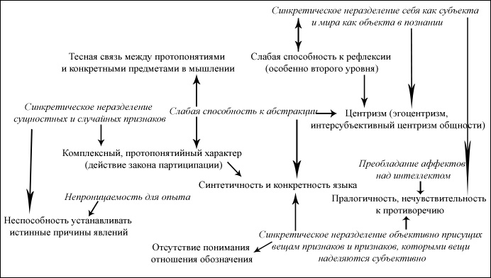 В первобытном мышлении, в отличие от современного, логического, доминируют коллективные представления, действует пралогический закон партиципации (сопричастности); оно нечувствительно к противоречию; непроницаемо для опыта; мистично, в нём нет стремления к рациональному познанию мира и причинно-следственных связей, действующих в мире. Первобытное мышление группирует объекты не по общим для них существенным признакам, а по приписываемым этим объектам мистическим качествам.