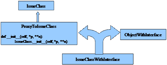 В качестве расширения для мета-типа был использован pli.interface.objects.ObjectWithInterface уже содержащий в себе интерфейс (в терминологии pli.interface.interface). Был создан класс IssueObjectWithInterface унаследованный от IssueClass (класс, реализующий интерфейс) и указанного выше расширения. К сожалению, из-за технических тонкостей наследоваться прямо от IssueClass нельзя. Это вызвано тем, что интерфейс внутри объекта ObjectWithInterface создается при помощи метода __new__ создающего объект instance object ObjectWithInterface, однако далее должен вызываться конструктор __init__ класса IssueClass, который первым параметром должен получать объект типа instance object IssueClass. Для решения этой проблемы пришлось создать промежуточный класс (ProxyToIssueClass) унаследованный от IssueClass и с определенным конструктором __init__ в котором вызывается конструктор __init__ класса IssueClass (к сожалению, так как в Roundup используются только old-style классы __init__, приходится вызывать от IssueClass явно, а не через super, хотя в данном случае это не очень принципиально). Соответственно IssueObjectWithInterface унаследован уже не от IssueClass, а от ProxyToIssueClass (см. схему)