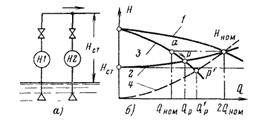 Предположим что каждый из нагнетателей работает в номинальном режиме с и , так что суммарная производительность насосов составляет . При отключении одного из нагнетателей режим оставшегося в работе нагнетателя изменяется в соответствии с его Q —