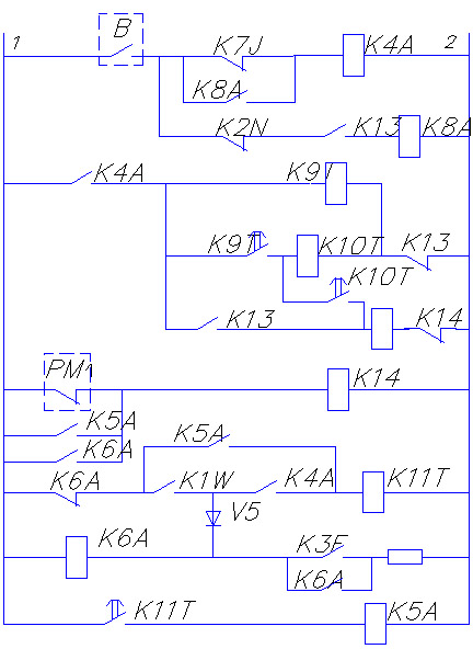 d в цепи реле К4А. Двигатель подключается к сети и начинает разгонятся в асинхронном режиме. Ток в его статоре по мере увеличения скорости падает. При снижении тока до определенной величины, реле тока К7J отпадает и замыкает свой контакт в цепи катушки контактора К4А. Последний срабатывает и собирает цепь реле времени КК9Т. Оно с выдержкой времени замыкает свой контакт в цепи реле времени К10Т, которое в свою очередь включает контакт возбуждения К13.