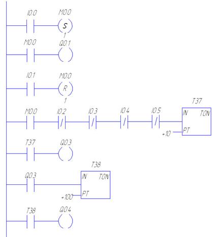 Схема работает следующим образом. Нормально разомкнутый контакт I0.0 это кнопка Пуск, при нажатии которой происходит запоминание состояния М0.0 из 0 в 1. М0.0 замыкает свой контакт и подает сигнал на световую сигнализацию – Q0.1. Так же М0.0 замыкает свой контакт в ветви №4, и при условии, что ни одна из защит и блокировок I0.2 – I0.6 не находятся в сработавшем положении, т.е. все в порядке, то запускается таймер, который через одну секунду (таймер Т37) подаст сигнал на исполнительный контактор Q0.3 который включит вакуумный выключатель и подаст напряжение на двигатель.
