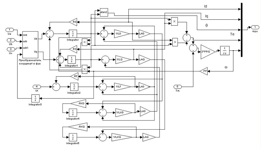Моделирование синхронного двигателя выполняется по дифференциальным уравнениям, описывающим поведение синхронного двигателя в переходных режимах. В основу моделирования принята система полных дифференциальных уравнений Горева - Парка, составленные для синхронной машины, фазовые обмотки статора которой расположены симметрично, и характеризуются одинаковыми параметрами, а на роторе, помимо одноосной обмотки возбуждения, имеются короткозамкнутые демпферные обмотки. Такая машина вполне соответствует двигателю СТД - 4000 - 2У4.