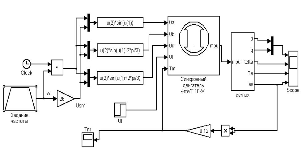Моделирование синхронного двигателя проводится в пакете прикладных программ Mathlab 6,5. Структурная схема модели приведена в Приложении 1.