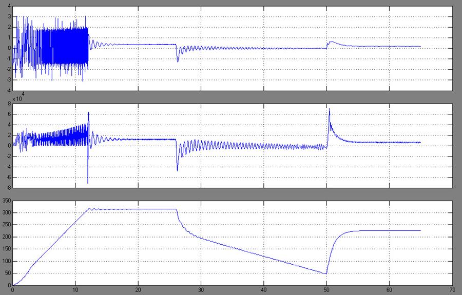Момент изменяется от 12500 при рад/с, что соответствует частоте вращения 3000 об/мин, до 6000 при рад/с, что соответствует 2150 об/мин. Частота при этом снизилась с 50 Гц до 36 Гц.