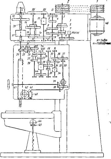 - электропривод, состоящий из двигателя (9), обеспечивающего главное движение и подачу шпинделя; двигателя (6) поворота гильзы (4) с траверсой (11) вокруг колонны (2); двигателя (7) перемещения траверсы по вертикали;